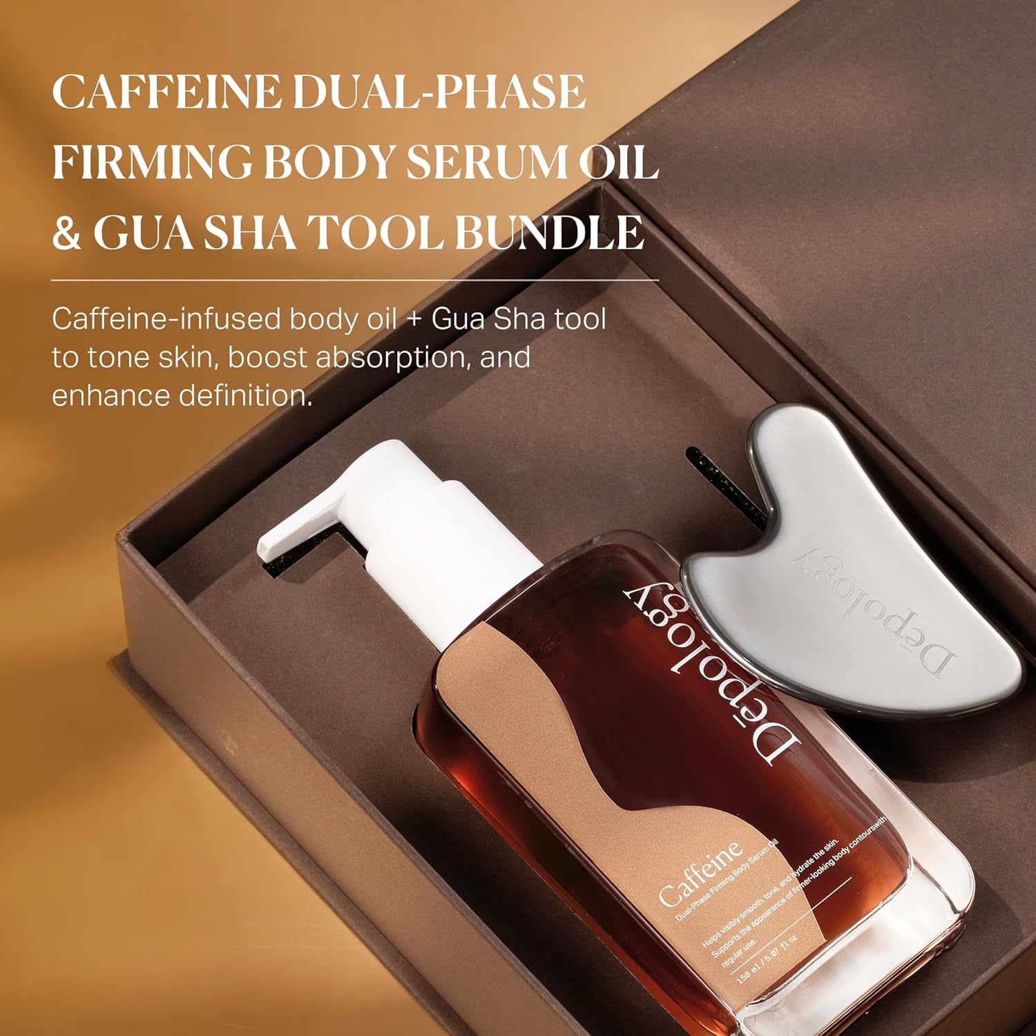 depology Caffeine Body Firming Serum Oil – Non-greasy Hydrating Body Glow Dual-Phase Oil for Dry, Aging Skin with Gua Sha Tool – Skin Tightening Oils with Squalane, Camellia & Caffeine – 5.07 fl oz