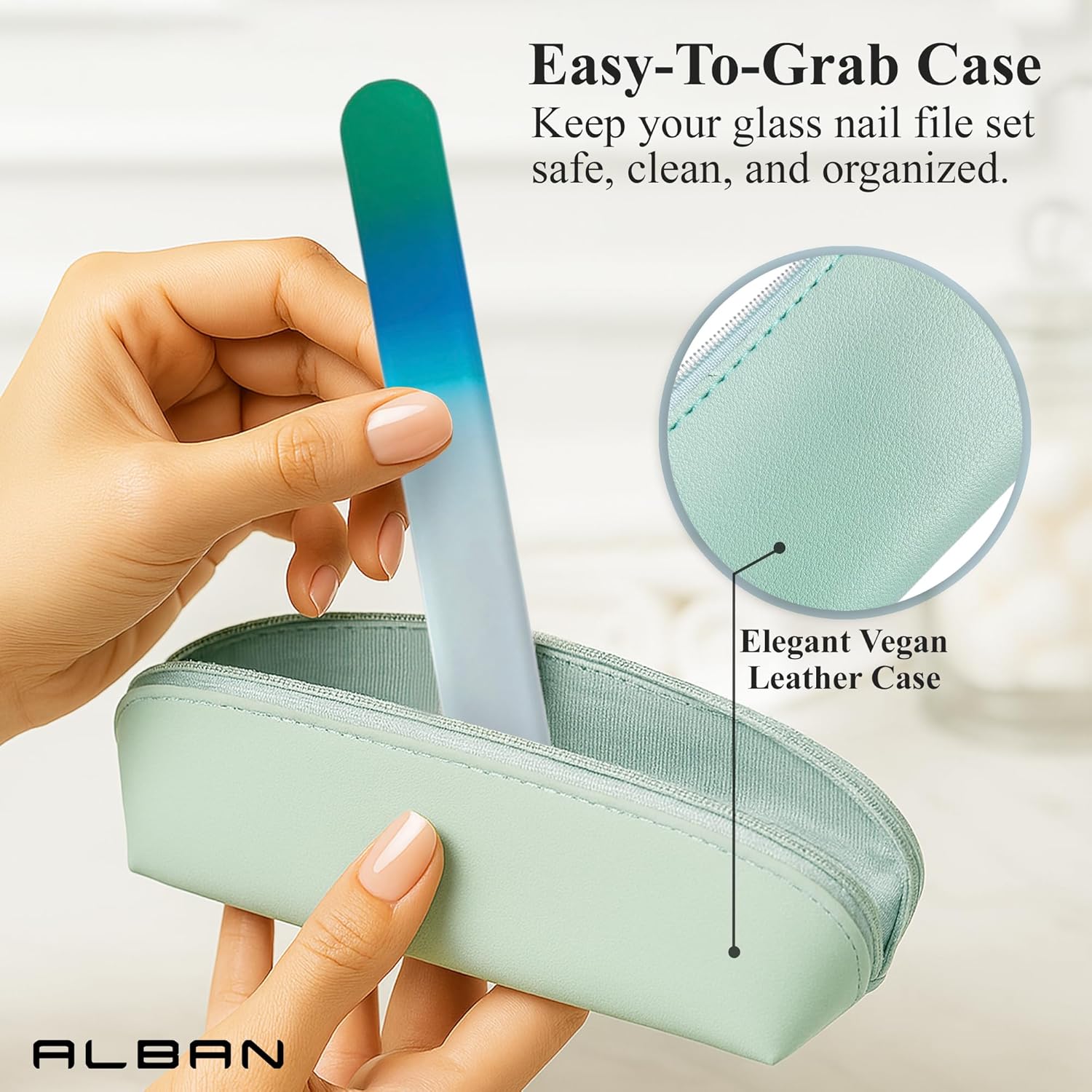 Alban Czech Glass Nail File Set with Manicure Stick & Vegan Leather Cosmetic Case (Green-Blue Nail Files, Light Blue Manicure Stick & Cosmetic Case)