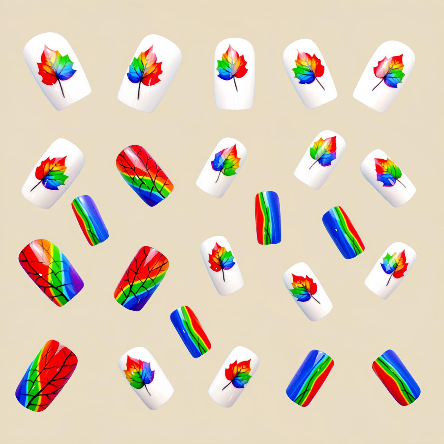 Rainbow Maple Leaf Press on Nails Fall Medium Square Fake Nails Glossy Thanksgiving Acrylic Glue on Nail Autumn Maple Leaves Artificial Stick on Nail for Women DIY Manicure
