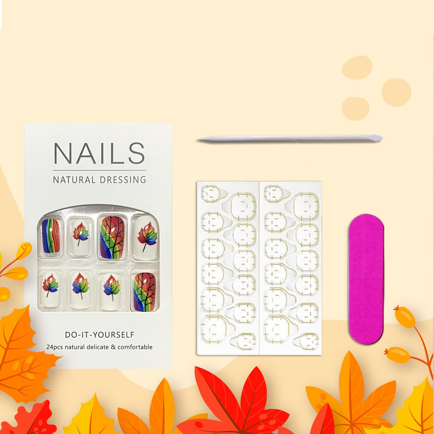 - Package: You'll get 24 fall maple leaf fake nails in 12 sizes. 1 mini nail file, 1 small wooden stick, 1 piece of adhesive tab glue. You can safely choose a fake nail that fits your finger size and DIY your desired nail shape